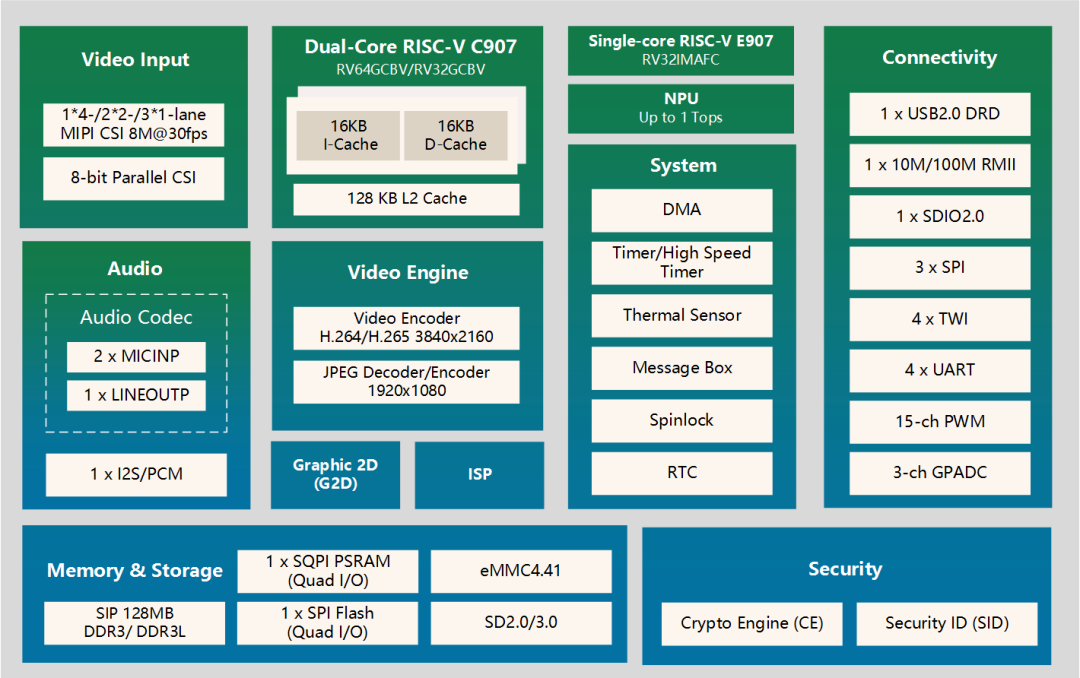 采用高度集成的异构计算架构,搭载双核RISC – V XuanTie C907处理器与单核RISC – V XuanTie E907实时MCU,提供强大通用算力支持,扩展多种音视频算法,提升系统启动与响应性能,满足高流畅度解码需求。