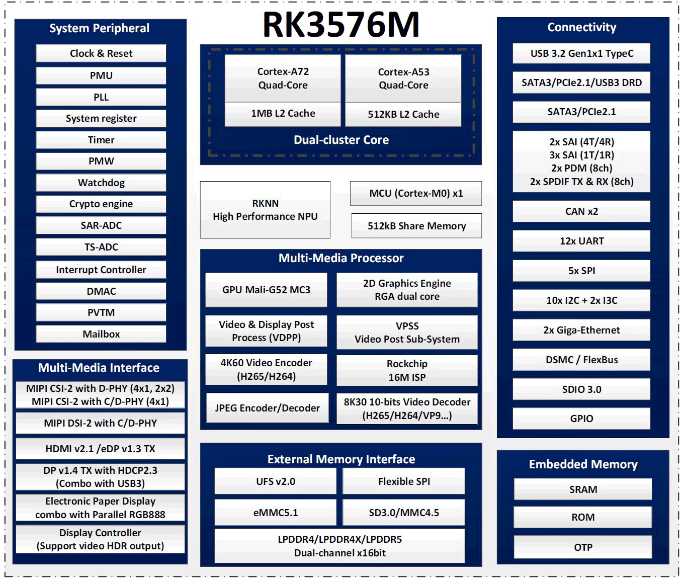 RK3576M 是一款低功耗、高性能的汽车应用处理器,集成了四核 Cortex-A72 和四核 Cortex-A53,并分别带有 NEON 协处理器。