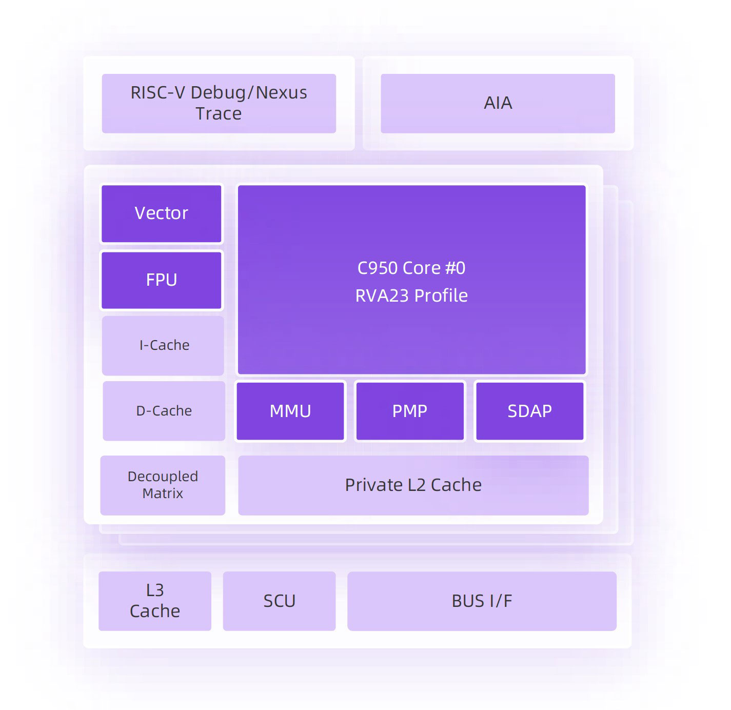 内存子系统采用高性能多级缓存架构:一级数据缓存加载到使用延迟极低,仅4周期;每个核心配备私有二级缓存,支持大容量配置;内存管理单元支持多种RISC-V虚拟内存模式与两级地址转换。