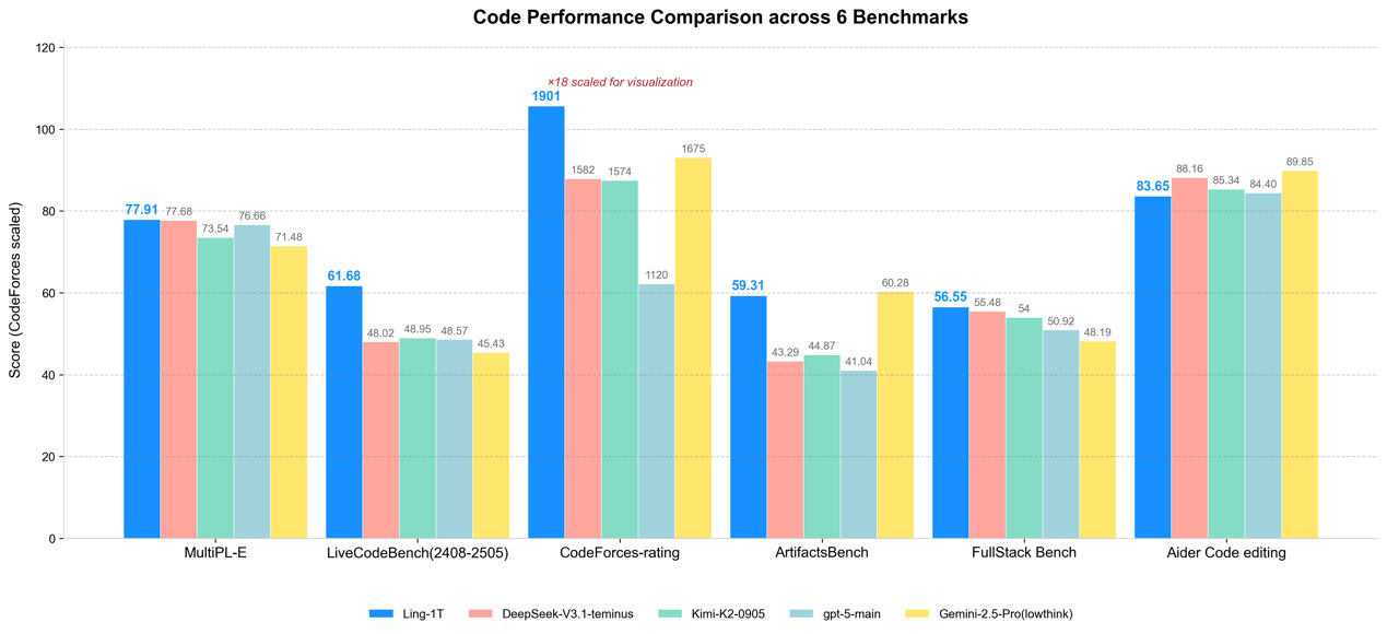 混合奖励机制:从功能正确到美学感知的跨越在强化学习阶段,蚂蚁团队构建了 “语法 – 功能 – 美学” 三维奖励体系。以代码生成为例,模型不仅需确保语法正确、功能完整,还需生成具备界面美感的代码结构。这一设计使 Ling-1T 在 ArtifactsBench 前端能力基准中位列开源模型榜首,生成的代码在可读性与交互体验上达到专业开发者水平。