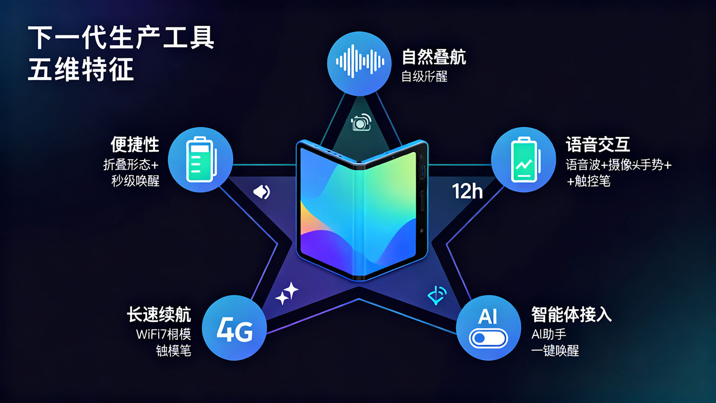 当云端服务成为智能体高效运行的基石,传统 PC 的形态与功能已无法满足智能体时代的生产力需求。下一代主流生产工具,必然围绕 “释放智能体潜力” 展开设计,需具备便捷性、自然交互、长续航、高速网络、智能体无缝接入五大核心特征,实现 “人 – 智能体 – 任务” 的高效衔接。