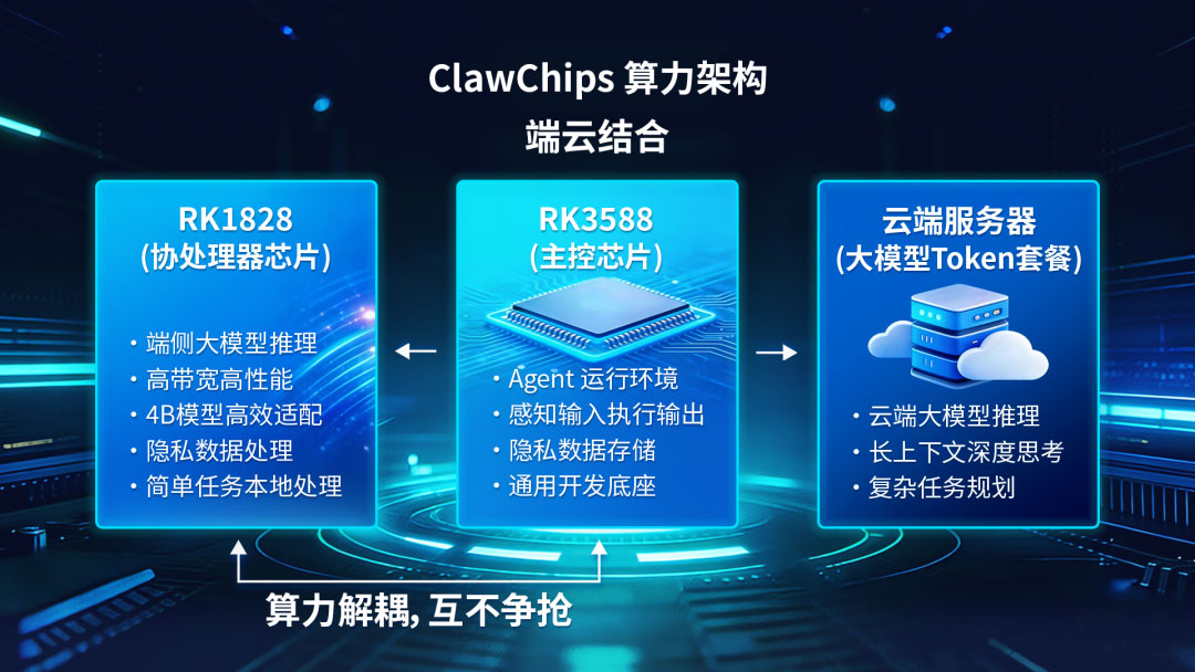 随着 OpenClaw 类 AI Agent 解决方案热度飙升,其落地痛点也逐渐显现。Token 成本高,日常交互若频繁调用云端大模型,费用不菲;隐私难保障,本地数据全量上云,让办公、家居等场景面临数据安全风险;行业落地难,办公、机器人等场景对设备外设交互和稳定性要求高,且受网络条件限制大。瑞芯微的 ClawChips 正是针对这些痛点而生,立足 AIoT2.0「感知 – 决策 – 执行」全链路架构,打造出安全原生、端云协同、场景原生的龙虾 Agent 落地方案。