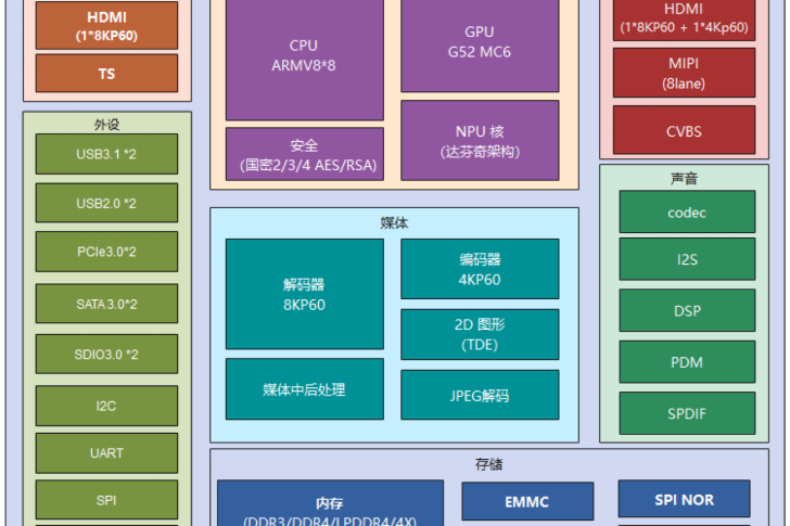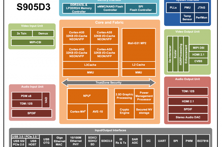 Amlogic(晶晨)的A311D系列处理器是目前量产的性能最强的通用型处理器,采用12nm先进制程,内置独立的NPU,可满足高端影音、人工智能、商业显示等场景的功能需求。为了方便用户二次开发,特此推出兼容Amlogic A311D S922X S905D3的板对板SOM核心板嵌入式系统,尺寸仅有40*32mm。