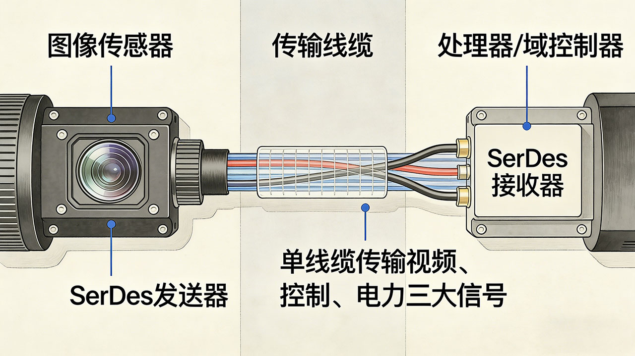 接收端:由SerDes接收芯片(将串行信号还原为并行信号)、处理器/域控制器(负责图像数据处理、控制指令反馈)组成,支持多相机同步接入,满足车载环视、机器人多视角感知等需求。