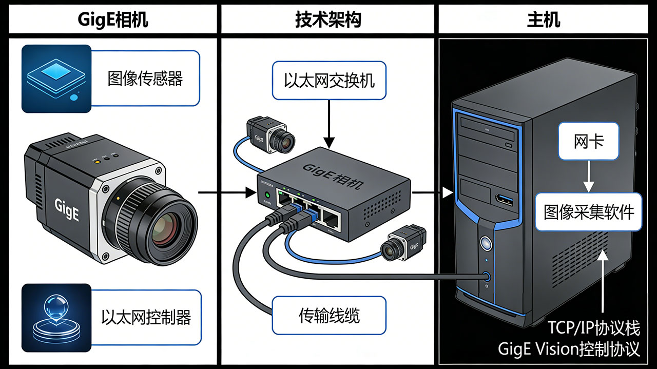 相机端:由图像传感器、以太网控制器(负责将图像数据封装为以太网数据包)、GigE Vision协议模块(实现设备控制、数据传输规范)组成,支持即插即用,兼容不同厂商的软硬件设备。