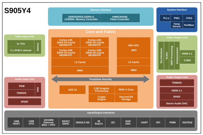 AmlogicS905Y4是一款通用型媒体处理器,专为混合OTT BOX/IP机顶盒(STB)和高端媒体盒应用而设计,主系统CPU是一个四核ARM Cortex-A35 CPU,Cortex-A35 CPU包括NEON SIMD协处理器,以提高软件媒体处理能力,支持4K场景下的媒体处理应用。